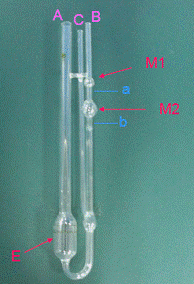 (b)用移液管加入4ml預先恒溫好的甲苯,對上述溶液進行稀釋,稀釋后的溶液濃度(c2)即為起始濃度c1的2/3。然后用同樣的方法測定濃度為c2的溶液的流出時間t2。與此相同,依次加入甲苯4ml、4ml、4ml,使溶液濃度成為起始濃度的1/2、2/5、1/3,分別測定其流出時間并記錄下來。注意每次加入純試劑后,一定要混合均勻,每次稀釋后都要將稀釋液抽洗粘度計的E球、毛細管、M2球和M1球,使粘度計內各處溶液的濃度相等,且要等到恒溫后再測定。